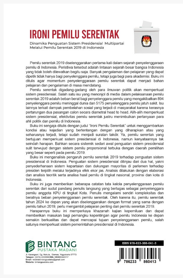 Buku ini sengaja ditulis dengan judul “Ironi Pemilu Serentak” untuk menggambarkan kondisi atau kejadian yang bertentangan dengan diharapkan atau yang seharusnya terjadi, tetapi sudah menjadi suratan takdir. Ya, pemilu serentak yang bertujuan memperkuat sistem presidensial di Indonesia, namun kenyataannya tak seindah harapan.